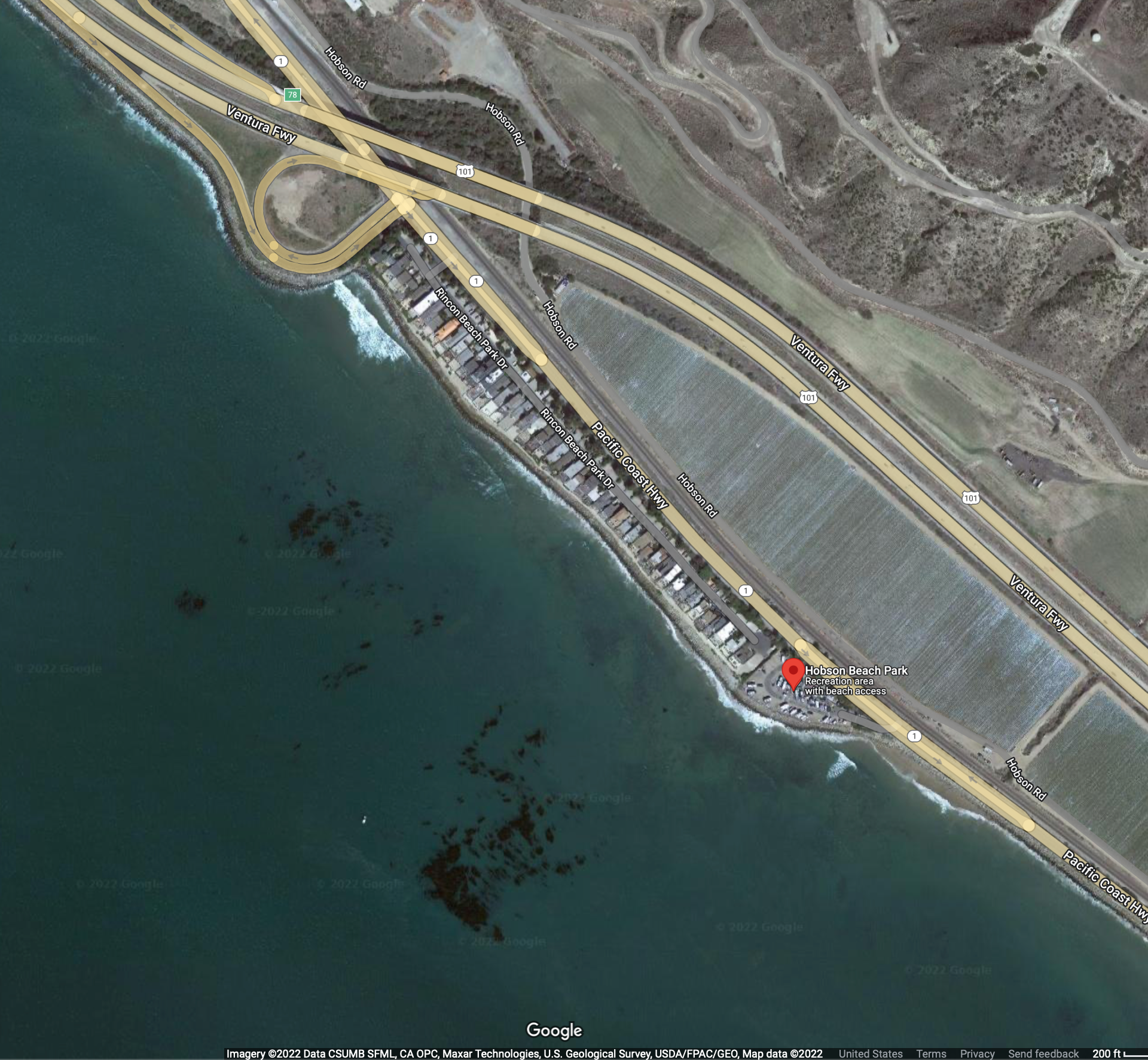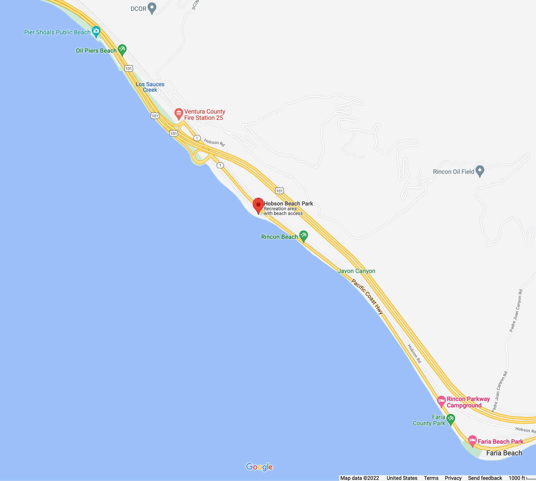 Hobson Beach Park is located North of Faria Beach Park and the Rincon Parkway. Similar to Faria Park, Hobson Park is wedged between the Pacific Ocean and the base of the Santa Ynez mountains along Highway 1 off the Ventura Freeway. The views of the Channel Islands are exceptional, and are most notable at dusk. This park is footsteps away from the Pacific Ocean.