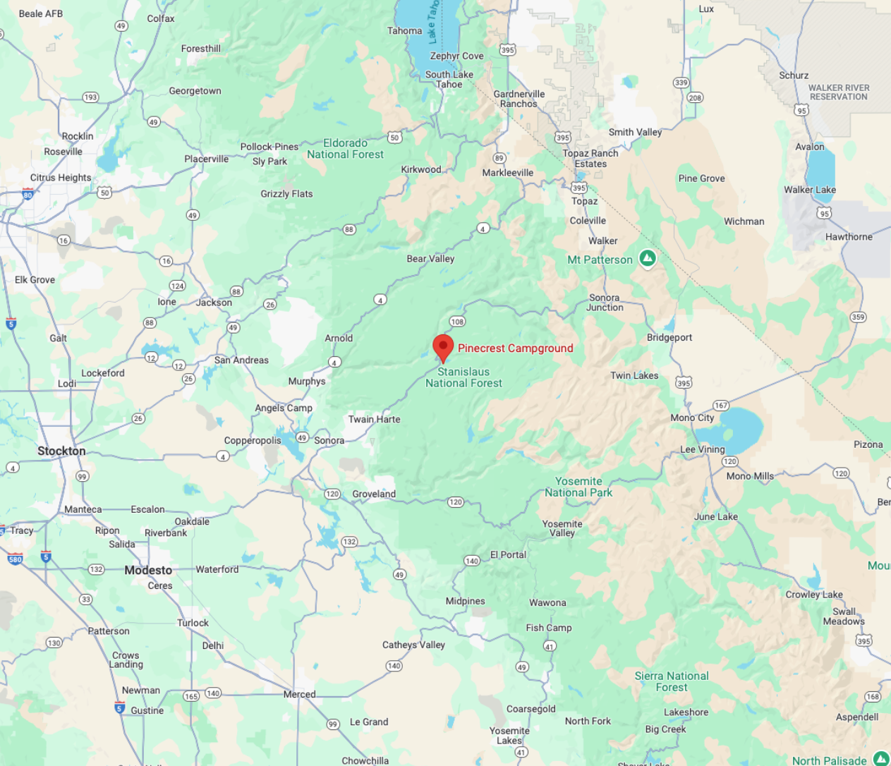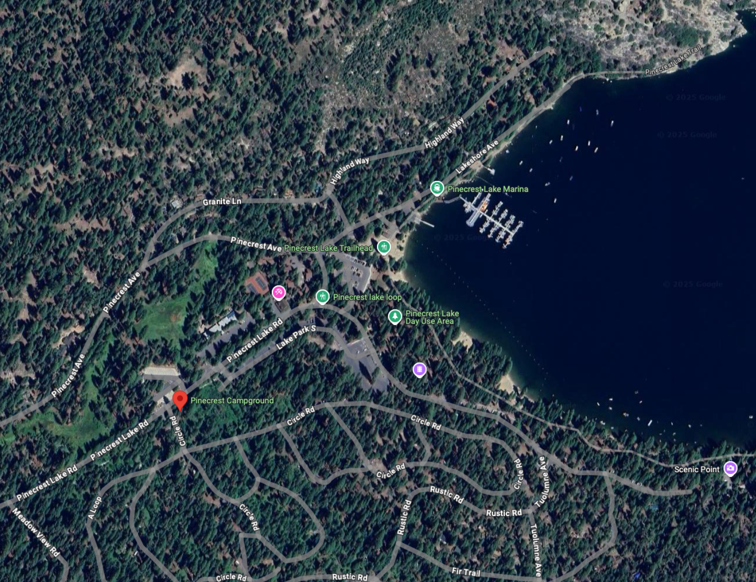 Pinecrest is an unincorporated community in the Stanislaus National Forest in Tuolumne County, California, United States. Pinecrest is located near Pinecrest Lake northeast of Mi-Wuk Village. Pinecrest Lake sits in what was once a meadow surrounded by granite outcroppings. Originally, Pinecrest Lake was called Strawberry Flat because of the wild strawberries that once grew there. In the 1960s the name was officially changed to Pinecrest. Pinecrest is a community of USFS Recreation Residences authorized by the United States Forest Service under the Occupancy Permits Act.[2] The campground adjacent to the lake is under the white fir, cedar, and sugar pine trees.